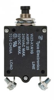 W23X1A1G-4/4 AMP CIRCUIT BREAKER/AC: 240V, DC: 50V, 50 VDC, panel mount, 1 pole, push button actuator, black, screw termination. Height: 35.15 mm Length: 40.64 mm Width: 17.53 mm